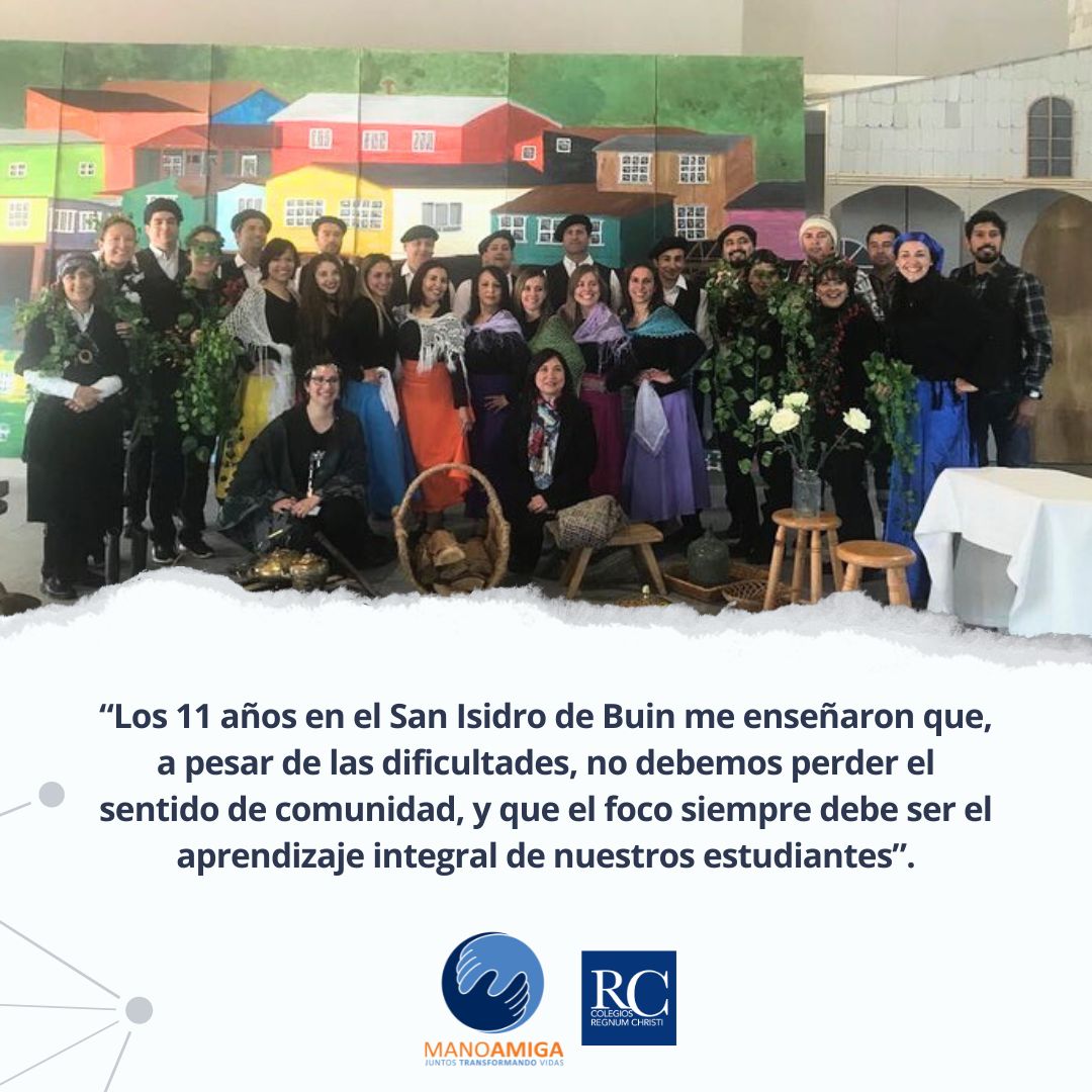 Los 11 años en el San Isidro de Buin me enseñaron que, a pesar de las dificultades, no debemos perder el sentido de comunidad, y que el foco siempre debe ser el aprendizaje integral de nuestros estudiantes. Creo que el liderazgo tiene que ver con prácticas enmarcadas en un modelo , que se distribuyen de manera organizada en los equipos para lograr objetivos comunes.